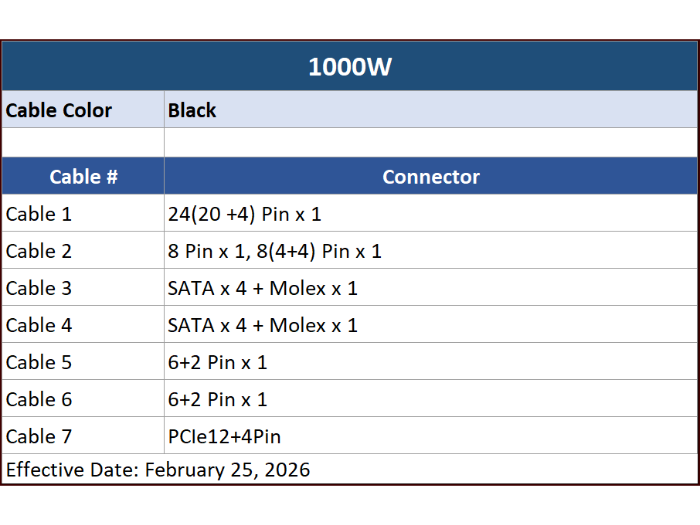 ATX24(20 +4) Pin x 1 8 Pin CPU x 1, (4+4) CPU x 1 SATA x 4 + Molex 4 Pin x 1 SATA x 4 + Molex 4 Pin x 1 PCIe 6+2 Pin x 1 PCIe 6+2 Pin x 1 12V-2x6 (H++) Cable Color: Black |