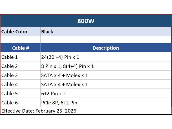 ATX Connector 24 (20+4) Pin x 1 P4-12V 4 Pin x 1 EPS 12V 8 Pin x 2 PCIE 6 Pin x 2 PCIE 6+2 Pin x 2 SATA 15 Pin x 8 Molex 4 Pin x 2 Floppy 4 Pin x 1 |