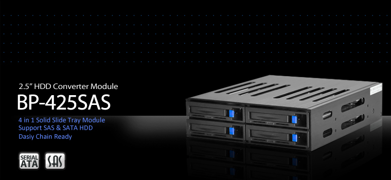 Athena Power BP-425SAS is a 2.5" quad drive internal mobile backplane unit. This unit is a design evolution from BP-1842C. Built with aluminum and Durable ABS mateirials, equipped with two hi-speed 40mm double roll ball-bearing cooling fan and operating at temperature less than 40 degrees. BP-425SAS can greatly reduce heat build-up, even when deployed with four 1T enterprise SATA and SAS disk drives. This backplane unit also featuring daisy chain function; for user who requires extra data storage capacity within a limited physical space, BP-425SAS will be a ideal product.