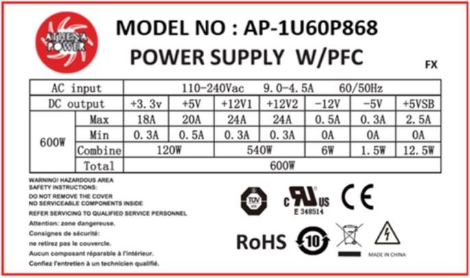 Athena Power standard 1U single 600W power supply, AP-1U60P868, designed for the standard 1U form factor (Length: 200mm). The AP-1U60P868 600 Watt PSU provides a compact fit alongside flexibility for small industrial computer rackmounts that is certified to the latest UL/TUV 62368-1 compliance. The EPS-12V 8Pin and the additional 8(4+4) Pin connector gives full support for core 2 dual processors. The AP-1U60P868 also includes the Active PFC (Power Factor Correction) and remote ON/OFF function for high efficiency and reliability. With its internal front and rear 40mm ball-bearing fan and thermal fan speed control, allow this PSU to handle heavy server loads.