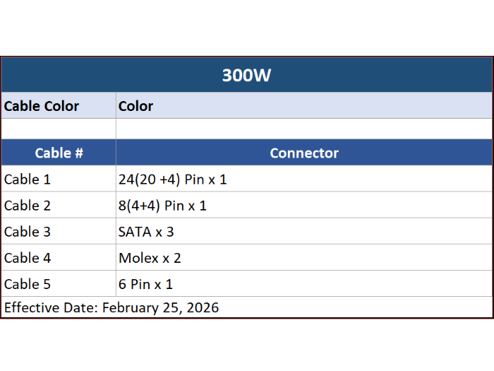 ATX Connector 24 (20+4) Pin x 1 P4-12V 4 Pin x 1 SATA 15 Pin x 2 Molex 4 Pin x 2 Floppy 4 Pin x 1 |